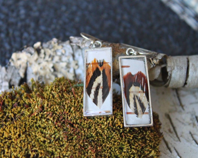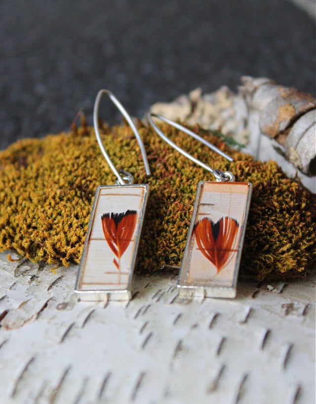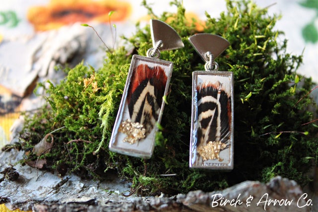 Mini Dangle earrings with charcoal resin overlaid with Birch Bark and 24k gold leaf.