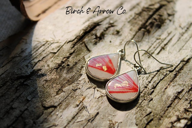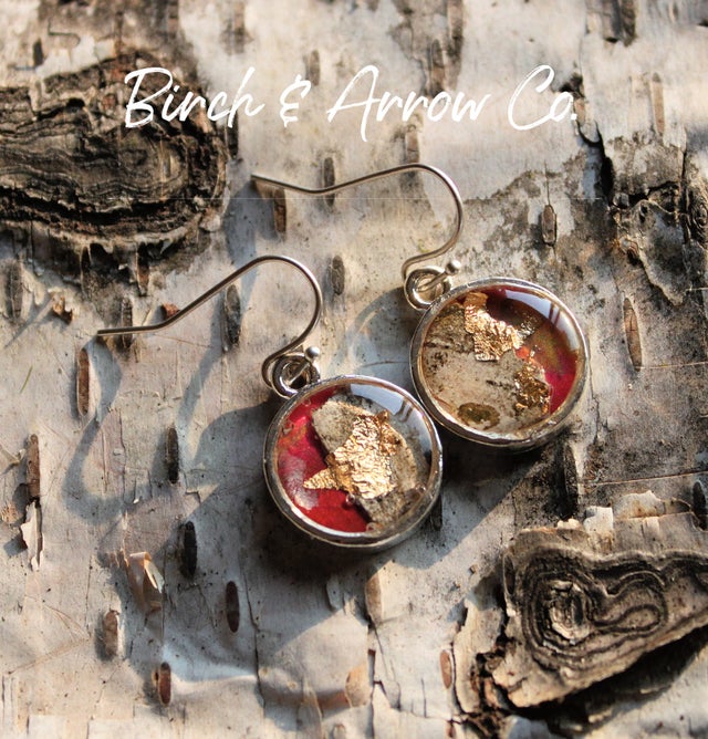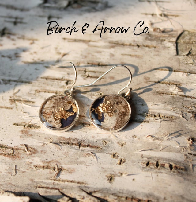 Mini Dangle earrings with navy blue resin overlaid with Birch Bark and 24k gold leaf.